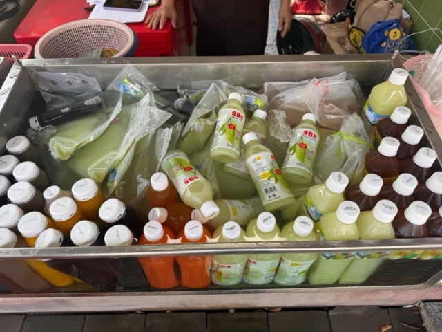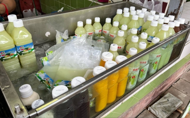 เมนูชูโรงคือ ‘น้ำฝรั่ง’ ที่ขายแบบถุง 25 บาท ขวดกลาง 35 บาท และขวดใหญ่ 45 บาท ซึ่งมีให้เลือกทั้งสูตรไม่ใส่น้ำตาล และสูตรเติมน้ำตาล 2%
