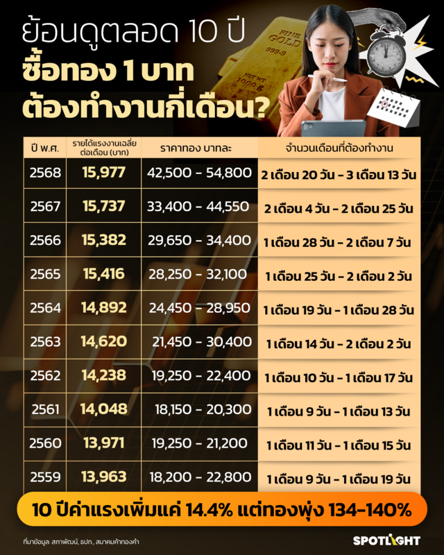ในบทความนี้ SPOTLIGHT จึงอยากชวนผู้อ่านมาสำรวจไปพร้อมกันว่า หากเปรียบเทียบค่าแรงเฉลี่ยรายเดือนของแรงงานไทยกับราคาทองคำในระยะเวลา 10 ปีที่ผ่านมาแล้ว ทั้งสองเคลื่อนไหวไปในทิศทางเดียวกันหรือไม่ และห่างกันมากเพียงใด อีกทั้งถ้าแรงงานทั่วไปอยากเก็บเงินซื้อทองหนึ่งบาท ต้องทำงานแบบไม่ต้องกินต้องใช้เป็นระยะเวลากี่เดือนจึงจะสามารถซื้อทองได้สำเร็จ
