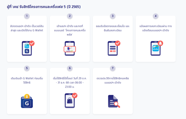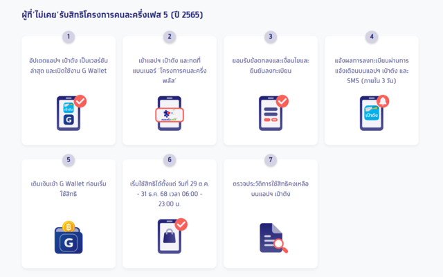 - ไม่เป็นผู้ที่ถูกระงับสิทธิหรือถูกเรียกเงินคืนในโครงการของรัฐ ได้แก่ (1) โครงการคนละครึ่ง (2) โครงการคนละครึ่ง ระยะที่ 2 (3) โครงการคนละครึ่ง ระยะที่ 3 (4) โครงการคนละครึ่ง ระยะที่ 4 และ (5) โครงการคนละครึ่ง ระยะที่ 5