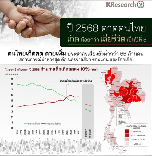 ข้อมูลจากศูนย์วิจัยกสิกรไทย (KResearch) ระบุว่า ในช่วง 9 เดือนแรกของปี 2568 มีเด็กเกิดใหม่เพียง 309,644 คน ลดลง 10% เมื่อเทียบกับปีก่อนหน้า ในขณะที่จำนวนผู้เสียชีวิตยังคงเพิ่มขึ้น ส่งผลให้จำนวนประชากรรวมของไทยอาจต่ำกว่า 66 ล้านคน ภายในสิ้นปีนี้