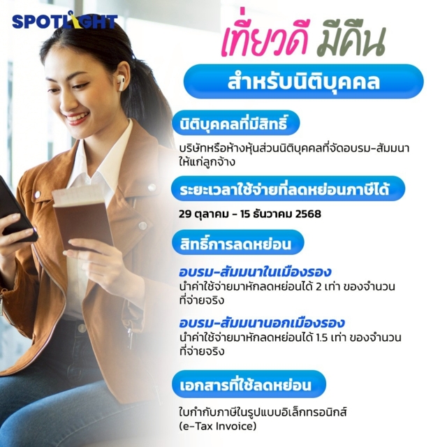 ‘เที่ยวดี มีคืน’ คือ มาตรการภาษีเพื่อสนับสนุนบุคคลธรรมดาท่องเที่ยวในประเทศ และมาตรการภาษีเพื่อสนับสนุนนิติบุคคลการจัดอบรม-สัมมนาภายในประเทศ โดยให้นำค่าใช้จ่ายจากการท่องเที่ยวของบุคคลธรรมดา และการอบรม-สัมมนาของนิติบุคคล ในระหว่างวันที่ 29 ตุลาคม ถึง 15 ธันวาคม 2568 มาหักค่าลดหย่อนในการยื่นภาษีปี 2568