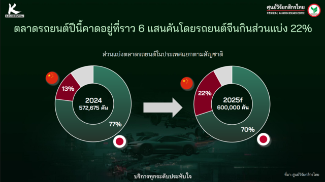 นางหทัยวัลคุ์ กล่าวต่อว่า ส่วนแบ่งตลาดของค่ายจีนในตลาดรถยนต์ไทยเพิ่มขึ้นจาก 13% ในปีที่แล้ว คาดว่าจะขึ้นมาอยู่ที่ราว 22% ในปีนี้ ท่ามกลางสภาพตลาดที่หดตัวเหลือเพียงราว 600,000 คัน จากระดับเกือบหนึ่งล้านคันในอดีต ภาวะตลาดที่เล็กลงทำให้การแข่งขันรุนแรงขึ้น และกระทบต่อผู้ผลิตทุกค่าย โดยเฉพาะค่ายญี่ปุ่นที่ต้องเผชิญการสูญเสียพื้นที่ตลาดให้กับผู้เล่นรายใหม่