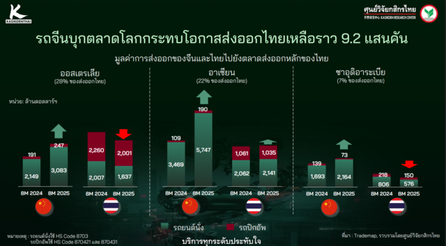 แรงกดดันจากจีนยังส่งผลถึงแนวรบหลักของไทยอย่างตลาดส่งออก ซึ่งปี 2568 คาดว่าจะลดลงต่ำกว่าหลักล้านคัน เหลือเพียง 920,000 คัน ขณะที่การผลิตลดลงเหลือ 1.43 ล้านคัน ใกล้ระดับช่วงโควิด-19 หนึ่งในสาเหตุมาจากการที่จีนขยายฐานการผลิตและส่งออกไปยังตลาดเดิมของไทย เช่น ออสเตรเลีย อาเซียน และตะวันออกกลาง ผนวกกับมาตรฐานสิ่งแวดล้อมที่เข้มงวดขึ้นในต่างประเทศ โดยเฉพาะออสเตรเลียซึ่งเป็นตลาดส่งออกสำคัญ ทำให้ไทยจำเป็นต้องเร่งปรับโครงสร้างการผลิตให้สอดคล้องกับแนวโน้มโลกที่มุ่งสู่รถพลังงานสะอาด เพื่อรักษาศักยภาพการส่งออกและสถานะ “ดีทรอยต์แห่งเอเชีย” ไว้ในระยะยาว