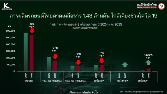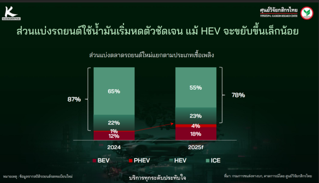 ศูนย์วิจัยกสิกรไทยสรุปว่า ภายใต้แรงกดดันจากภาษีนำเข้าของสหรัฐฯ การแข่งขันรุนแรงจากจีน มาตรฐานสิ่งแวดล้อมที่เข้มงวดขึ้น และกระแสรถยนต์ไฟฟ้าที่ขยายตัวรวดเร็ว ผู้ประกอบการไทยจำเป็นต้องเร่งปรับกลยุทธ์ให้สอดคล้องกับทิศทางของตลาดโลก ซึ่งกำลังเปลี่ยนผ่านจากรถยนต์สันดาปภายในสู่ยานยนต์พลังงานทางเลือก ทั้งไฮบริด HEV และ PHEV พร้อมจับตาโอกาสใหม่ในตลาดรถยนต์ไฟฟ้าเต็มรูปแบบหรือ BEV ที่กำลังเติบโตอย่างรวดเร็วในภูมิภาค