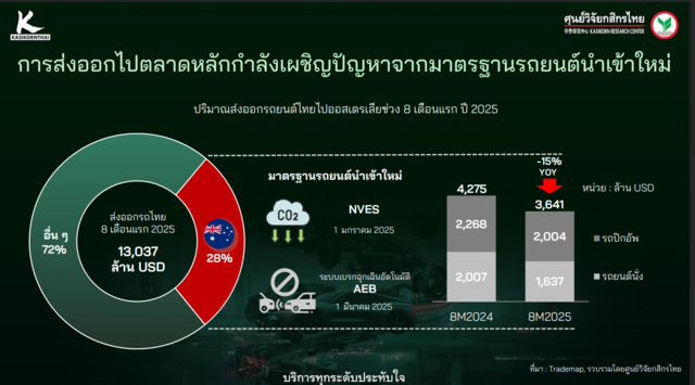 นางหทัยวัลคุ์ ระบุว่า มาตรการใหม่นี้เปิดโอกาสให้ประเทศที่มีศักยภาพด้านการผลิตรถพลังงานสะอาดขยายตลาดส่งออกได้มากขึ้น แต่ไทยซึ่งยังพึ่งพาการผลิตรถยนต์ใช้น้ำมันเป็นหลัก ขณะที่กำลังการผลิต HEV, PHEV และ BEV ยังมีจำกัด จึงอาจเสียเปรียบในตลาดออสเตรเลีย ซึ่งปัจจุบันนำเข้ารถยนต์จากไทยเกือบหนึ่งในสามของทั้งหมด หรือราว 28% โดยในช่วง 8 เดือนแรกของปี 2568 มูลค่าการส่งออกรถยนต์ไทยไปออสเตรเลียหดตัวลงแล้ว 15% เมื่อเทียบกับปีก่อนหน้า