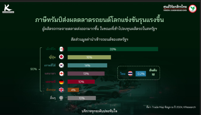 ด้านสถานการณ์ตลาดรถยนต์โลก ดร.รุจิพันธ์ อัสสะรัตน์ ผู้ช่วยกรรมการผู้จัดการ ศูนย์วิจัยกสิกรไทย จำกัด วิเคราะห์ว่า มาตรการภาษีนำเข้า Section 232 ของรัฐบาลสหรัฐฯ กำลังสร้างแรงสั่นสะเทือนเชิงโครงสร้างต่ออุตสาหกรรมยานยนต์ทั่วโลก ผู้ผลิตรายใหญ่อย่างญี่ปุ่นและเกาหลีใต้เริ่มเร่งกระจายตลาดไปภูมิภาคอื่นเพื่อลดการพึ่งพาสหรัฐฯ ส่งผลให้การแข่งขันในตลาดโลกรุนแรงขึ้นอย่างหลีกเลี่ยงไม่ได้