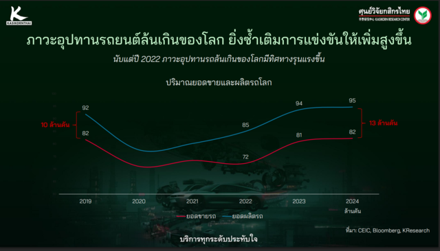 ขณะเดียวกัน อุตสาหกรรมยานยนต์โลกกำลังเผชิญภาวะอุปทานล้นตลาด (Global Oversupply) ซึ่งรุนแรงขึ้นต่อเนื่อง ปี 2562 โลกผลิตรถยนต์ได้ 92 ล้านคัน แต่ขายได้เพียง 82 ล้านคัน ส่วนเกินถึง 10 ล้านคัน แม้ช่วงโควิด-19 จะชะลอการผลิต แต่เมื่อเศรษฐกิจกลับมาฟื้นตัว การผลิตก็เร่งขึ้นเร็วกว่าความต้องการ โดยปี 2567 โลกผลิตได้ 95 ล้านคัน ขายได้เท่าเดิม 82 ล้านคัน ส่วนเกินพุ่งเป็น 13 ล้านคัน ซึ่งเป็นระดับสูงสุดในรอบหลายปี ความไม่สมดุลนี้ทำให้การแข่งขันทั่วโลกทวีความรุนแรง และบีบให้ผู้ผลิตต้องลดต้นทุน ขยายตลาดใหม่ และเพิ่มสัดส่วนสินค้าที่มีมูลค่าสูงขึ้น