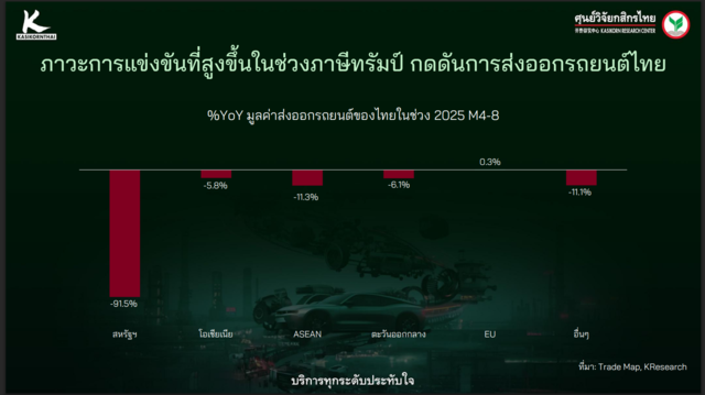แรงกระเพื่อมดังกล่าวเริ่มส่งผลต่อไทยอย่างเห็นได้ชัดในปี 2568 การส่งออกรถยนต์ไทยไปสหรัฐฯ ระหว่างเดือนเมษายนถึงสิงหาคมหดตัวถึง -91.5% จากปีก่อน ซึ่งถือเป็นการลดลงมากที่สุดในบรรดาตลาดหลักทั้งหมด ปัจจัยสำคัญมาจากมาตรการภาษีและการย้ายฐานการผลิตของผู้ผลิตรายใหญ่เข้าสู่สหรัฐฯ เอง ขณะเดียวกัน ตลาดส่งออกอื่น ๆ ก็อ่อนตัวตาม โดยอาเซียนลดลง -11.3%, ตะวันออกกลาง -6.1%, โอเชียเนีย -5.8% และตลาดอื่นทั่วโลกลดลง -11.1% ยกเว้นสหภาพยุโรปที่ยังขยายตัวเล็กน้อย +0.3%