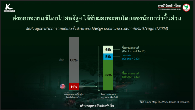 ทั้งนี้ หากพิจารณาจากข้อมูลการส่งออกของไทยจะพบว่ามาตรการภาษีของสหรัฐฯ มีแนวโน้มส่งผลต่อการส่งออกชิ้นส่วนรถยนต์มากกว่ารถยนต์ทั้งคัน เพราะจากมูลค่าการส่งออกรถยนต์สำเร็จรูปและชิ้นส่วนรถยนต์จากไทยไปสหรัฐฯ ซึ่งคิดเป็น 14% ของการส่งออกรถยนต์และชิ้นส่วนทั้งหมดของไทย ในกลุ่มนี้ส่วนใหญ่ถึง 89% เป็น “ชิ้นส่วนรถยนต์” ที่อยู่ภายใต้กฎหมาย Section 232 ขณะที่รถสำเร็จรูปมีเพียง 5% และอีก 6% อยู่ในกลุ่ม “Reciprocal Tariff” หรือภาษีตอบโต้ การพึ่งพาตลาดชิ้นส่วนจึงมีความสำคัญสูงกว่าอย่างชัดเจน ผลกระทบของนโยบายจึงเกิดในห่วงโซ่อุปทานมากกว่าการค้ารถยนต์ทั้งคัน