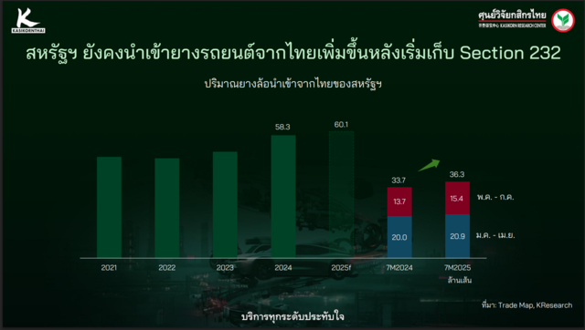 ขณะเดียวกัน ยางรถยนต์ไทยยังคงขยายตัวในตลาดสหรัฐฯ อย่างต่อเนื่อง โดยคาดว่าปริมาณนำเข้าในปี 2568 จะเพิ่มจาก 58.3 ล้านเส้นในปี 2567 เป็น 60.1 ล้านเส้น และในช่วง 7 เดือนแรกของปี 2568 สหรัฐฯ นำเข้าจากไทยแล้วถึง 36.3 ล้านเส้น เพิ่มขึ้นจาก 33.7 ล้านเส้นในช่วงเดียวกันในปีก่อนหน้า