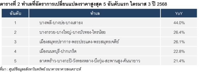 ทำเลที่มีอัตราการขยายตัวของราคาที่ดินสูงสุด 5 อันดับแรกในไตรมาส 3 ปี 2568 เมื่อเทียบกับช่วงเดียวกันของปีก่อนหน้า (YoY) ได้แก่