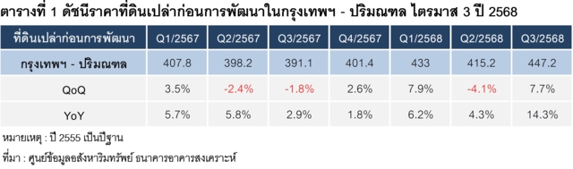 บทวิเคราะห์เรื่อง “ดัชนีราคาที่ดินเปล่าก่อนการพัฒนา ในกรุงเทพฯ - ปริมณฑล ไตรมาส 3 ปี 2568” ที่จัดทำโดยศูนย์ข้อมูลอสังหาริมทรัพย์ (REIC) ธนาคารอาคารสงเคราะห์ (ธอส.) ระบุว่า ดัชนีราคาที่ดินเปล่าก่อนการพัฒนา ในกรุงเทพฯและปริมณฑล ณ ไตรมาส 3 ปี 2568 มีค่าดัชนีเท่ากับ 447.2 จุด เพิ่มขึ้น 7.7% เมื่อเทียบกับไตรมาสก่อนหน้า (QoQ) และเพิ่มขึ้น 14.3% เมื่อเทียบกับช่วงเดียวกันของปีก่อนหน้า (YoY) ซึ่งเป็นการขยายตัวมากกว่า 10.0% เป็นครั้งแรกในรอบ 10 ไตรมาส นับตั้งแต่ไตรมาส 1 ปี 2566