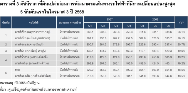 สำหรับราคาที่ดินเปล่าก่อนการพัฒนาตามแนวเส้นทางรถไฟฟ้า ในไตรมาส 3 ปี 2568 พบว่า เส้นทางรถไฟฟ้า 5 อันดับแรกที่มีอัตราการขยายตัวของราคาที่ดินสูงสุดมีรายละเอียด ดังนี้