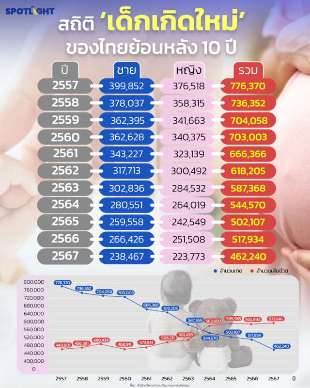 จากข้อมูลของกรมการปกครอง ระบุว่า ประเทศไทยมีจำนวนเด็กเกิดใหม่ลดลงต่อเนื่องทุกปี จากกว่า 8 แสนคนต่อปีในช่วงปี 2557 เหลือเพียงประมาณ 5 แสนคนในปี 2567 นับได้ว่าตลอดช่วง 10 ปีที่ผ่านมาประเทศไทยมีจํานวนประชากรเกิดใหม่น้อยลงต่อเนื่องทุกปี ในขณะที่จำนวนผู้เสียชีวิตกลับเพิ่มขึ้นทุกปีต่อเนื่องมาตั้งแต่ปี 2563 นอกจากการเกิดที่น้อยลงแล้วประเทศไทยยังต้องเผชิญกับ สังคมสูงอายุโดยสมบูรณ์ คือตั้งแต่ปี 2567 มีประชากรอายุ 60 ปีขึ้นไปคิดเป็น 1 ใน 5 ของประชากรทั้งหมด และในปี 67 ยังเป็นปีแรกในรอบ 75 ปี ที่จำนวนเด็กเกิดใหม่ต่ำกว่า 5 แสนคน วิกฤตโครงสร้างประชากร เป็นอีกหนึ่งปัจจัยกดดันการเติบโตทางเศรษฐกิจไทย เพราะส่งผลให้เกิด 3 ความเสี่ยงหลักไม่ว่าจะเป็น