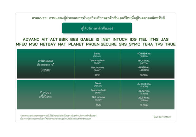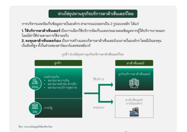 กระแสการใช้งานดิจิทัลในภาคเอกชนไทยเติบโตอย่างก้าวกระโดดในช่วงห้าปีที่ผ่านมา ส่งผลให้รายได้รวมของธุรกิจบริการดาต้าเซ็นเตอร์ขยายตัวเฉลี่ย 11.1% ต่อปี โดยกว่า 95% ของความต้องการจัดเก็บข้อมูลมาจากองค์กรธุรกิจเอกชนที่เพิ่มการใช้เทคโนโลยีสำหรับการวางแผนกลยุทธ์ การบริหารจัดการ และการเข้าถึงลูกค้า ทั้งยังต้องรองรับระบบใหม่ๆ เช่น AI ที่หลายบริษัทเริ่มนำมาใช้จริงจัง