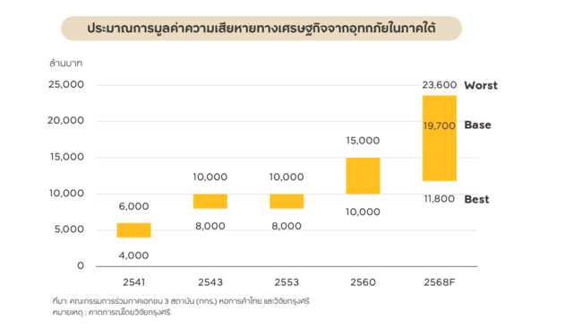 ภาคใต้กำลังเผชิญอุทกภัยครั้งใหญ่จากฝนที่ตกต่อเนื่อง อันเป็นผลจากอิทธิพลของร่องมรสุมและมวลอากาศชื้นจากอ่าวไทยที่ปกคลุมพื้นที่ยาวนานกว่าหนึ่งสัปดาห์ ศูนย์วิจัยกรุงศรีประเมินว่า ความเสียหายทางเศรษฐกิจจากการหยุดชะงักของกิจกรรมการค้า การท่องเที่ยว และภาคบริการ มีมูลค่าสูงราว 1.18-2.36 หมื่นล้านบาท สะท้อนต้นทุนทางเศรษฐกิจที่พุ่งสูงขึ้นตามระดับน้ำท่วมขังและความไม่แน่นอนของการฟื้นตัวในระยะถัดไป