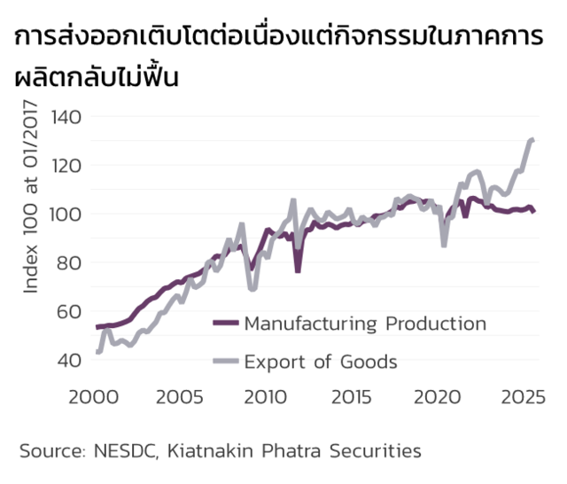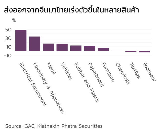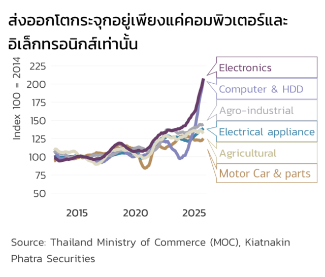 เมื่อพิจารณาในเชิงโครงสร้างสินค้า จะเห็นว่าการเติบโตของการส่งออกไทยในช่วงหลายปีที่ผ่านมา กระจุกตัวอยู่ในหมวดคอมพิวเตอร์และอิเล็กทรอนิกส์เป็นหลัก โดยคิดเป็นสัดส่วนกว่า 60% ของการเพิ่มขึ้นของมูลค่าการส่งออกที่ไม่รวมทองคำและเครื่องประดับ ซึ่งถือว่าสูงมาก KKP Research ประเมินว่ามีความเป็นไปได้ที่สินค้ากลุ่มนี้จะมีมูลค่าเพิ่มภายในประเทศค่อนข้างจำกัด และอาจเข้าข่ายการสวมสิทธิจากจีน สอดคล้องกับข้อเท็จจริงที่ว่ากิจกรรมในภาคการผลิตไม่ได้ขยายตัวตามการเร่งขึ้นของการส่งออกอย่างมีนัยสำคัญ