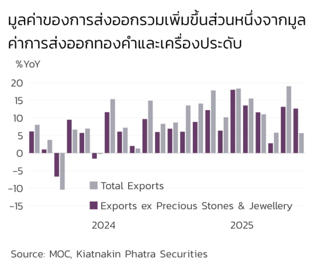 ปัจจัยแรกคือความผันผวนของมูลค่าการส่งออกรายเดือนจากการเคลื่อนไหวของราคาทองคำและเครื่องประดับ การส่งออกที่ขยายตัวดีในปีนี้ส่วนหนึ่งเป็นผลจากราคาทองคำที่ปรับตัวสูงขึ้น แต่เนื่องจากประเทศไทยไม่ได้เป็นผู้ผลิตทองคำ ทำให้ไม่ได้มีกิจกรรมการผลิตในประเทศโดยตรง และยังอยู่ในสถานะนำเข้าสุทธิในหมวดทองคำ เมื่อมูลค่าการส่งออกทองคำเพิ่มขึ้นจนมีสัดส่วนสูงขึ้นเมื่อเทียบกับการส่งออกทั้งหมด ตัวเลขการส่งออกโดยรวมจึงขยายตัวโดยอัตโนมัติ แม้ว่ากิจกรรมในภาคการผลิตจะไม่ได้เพิ่มขึ้นตามไปด้วย