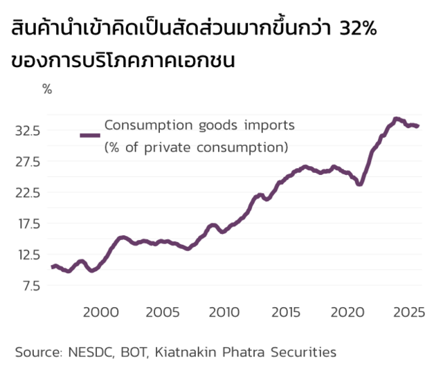 นอกเหนือจากประเด็นมูลค่าเพิ่มของสินค้าส่งออกไทยที่ลดลง อีกหนึ่งความเสี่ยงสำคัญที่เริ่มชัดเจนขึ้นคือการนำเข้าที่เร่งตัวอย่างต่อเนื่อง โดยในปี 2568 มูลค่าการนำเข้าขยายตัวมากกว่า 12% เมื่อเทียบกับปีก่อน แม้ข้อมูลส่วนหนึ่งสะท้อนว่าการนำเข้าที่เพิ่มขึ้นจำนวนมากเป็นวัตถุดิบและสินค้าทุนที่ใช้เพื่อการส่งออก โดยเฉพาะในอุตสาหกรรมอิเล็กทรอนิกส์ แต่ KKP Research ประเมินว่า สินค้านำเข้าหลายรายการที่มีแนวโน้มเพิ่มขึ้นอย่างมีนัยสำคัญเป็นสินค้าที่ใช้เพื่อการบริโภคภายในประเทศด้วย ไม่ว่าจะเป็นรถยนต์ เครื่องใช้ไฟฟ้า และสินค้าอุปโภคบริโภคทั่วไป