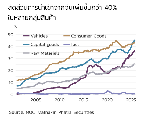 ภาพดังกล่าวสะท้อนว่าสินค้าจากต่างประเทศกำลังเข้ามาแข่งขันและตีตลาดในประเทศมากขึ้น โดยเฉพาะสินค้าราคาต่ำจากจีน ซึ่งเห็นได้จากสัดส่วนการนำเข้าสินค้าจีนต่อมูลค่านำเข้าทั้งหมดที่ปรับเพิ่มขึ้นต่อเนื่อง และในบางอุตสาหกรรมเริ่มส่งผลกระทบต่อภาคการผลิตภายในประเทศอย่างเป็นรูปธรรม
