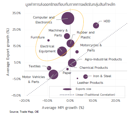 เมื่อพิจารณาความสัมพันธ์ระหว่างมูลค่าการส่งออกกับผลผลิตอุตสาหกรรมของไทยในช่วงที่ผ่านมา จะพบความไม่สอดคล้องที่ชัดเจนมากขึ้น สินค้าหลายหมวดที่มีมูลค่าการส่งออกเร่งตัวขึ้นอย่างรวดเร็วในอัตรา 15-30% กลับไม่ได้สะท้อนการขยายตัวของการผลิตภายในประเทศ ตรงกันข้าม ผลผลิตในประเทศของสินค้ากลุ่มเหล่านี้กลับหดตัวลง โดยเฉพาะในกลุ่มคอมพิวเตอร์และอิเล็กทรอนิกส์ที่ไม่รวมฮาร์ดดิสก์ เครื่องจักรกลและชิ้นส่วน รวมถึงเครื่องใช้ไฟฟ้า ซึ่งเป็นกลุ่มสินค้าหลักที่ขับเคลื่อนการเติบโตของการส่งออกไทยในช่วงหลัง