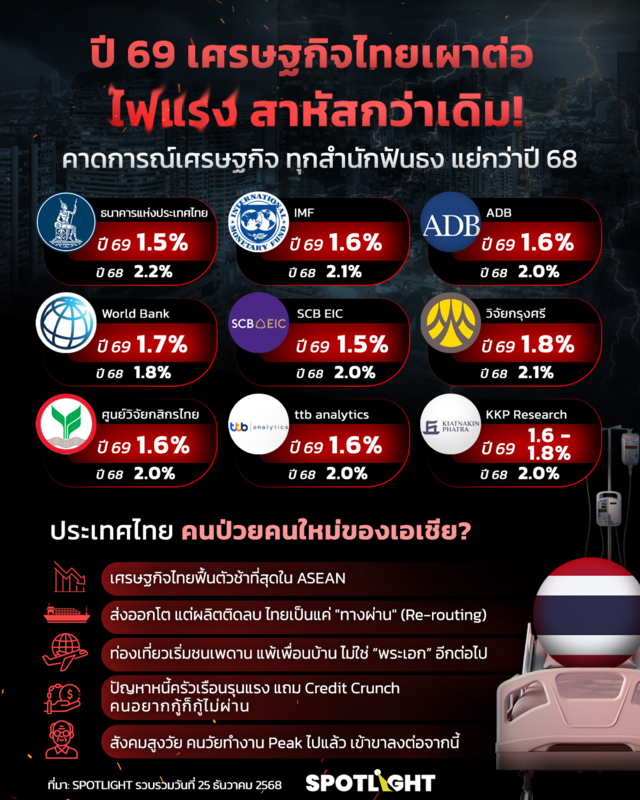 ด้านธนาคารพัฒนาเอเชีย (ADB) ในรายงาน Asian Development Outlook ประเมินเศรษฐกิจไทยปี 2569 เติบโตประมาณ 1.6% จากราว 2.0% ในปี 2568 โดยระบุว่าเศรษฐกิจไทยจะอ่อนแรงลงจากหลายปัจจัยกดดัน ทั้งการส่งออกที่ชะลอตัว การฟื้นตัวของนักท่องเที่ยวต่างชาติที่ล่าช้า และแรงส่งจากอุปสงค์ภายในประเทศที่อ่อนลง