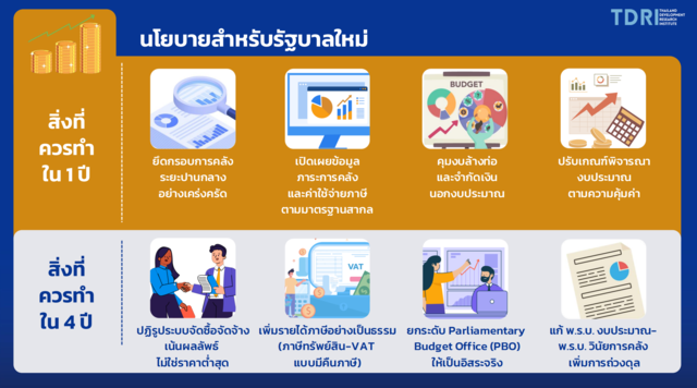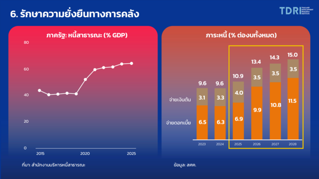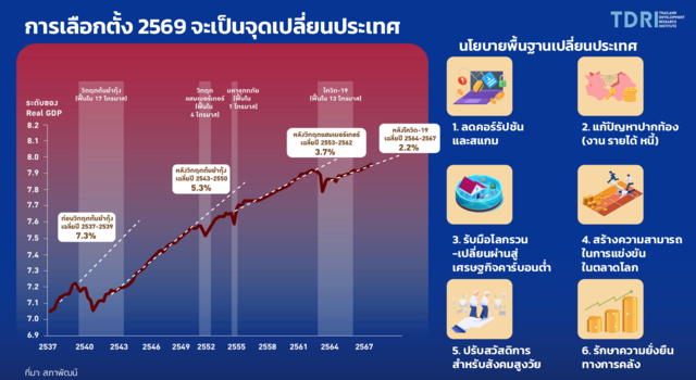 หากรัฐบาลใหม่ยังคงขับเคลื่อนนโยบายโดยไม่คำนึงถึงข้อจำกัดทางการคลัง ความเสี่ยงต่อเสถียรภาพเศรษฐกิจและความสามารถในการแข่งขันของประเทศจะยิ่งทวีความรุนแรง TDRI จึงเสนอกรอบนโยบายปฏิรูป 6 ด้าน เพื่อให้การ “เปลี่ยนประเทศ” หลังการเลือกตั้ง 2569 ตั้งอยู่บนฐานความจริงทางเศรษฐกิจ ไม่ใช่เพียงคำสัญญาทางการเมืองที่ไร้หลักประกันทางการคลัง
