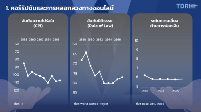 ดร.สมเกียรติ ระบุว่า ประเด็นแรกที่รัฐบาลใหม่จำเป็นต้องเร่งจัดการคือปัญหาคอร์รัปชันควบคู่กับการหลอกลวงทางออนไลน์ ซึ่งกำลังบ่อนทำลายโครงสร้างเศรษฐกิจและความเชื่อมั่นของประเทศอย่างรุนแรง โดยชี้ว่าดัชนีความโปร่งใสของไทยปรับตัวลดลงต่อเนื่อง จนหลุดจากกลุ่มประเทศที่มีความโปร่งใสในระดับสูง ขณะที่โครงการจัดซื้อจัดจ้างภาครัฐจำนวนมากยังมีปัญหา “เงินทอน” ในระดับ 20-30% พร้อมกับอันดับด้านนิติธรรมที่ถดถอย และความเสี่ยงด้านการฟอกเงินที่เพิ่มขึ้นอย่างชัดเจน