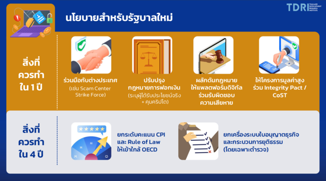 ในข้อเสนอเชิงนโยบาย ดร.สมเกียรติระบุว่า ภายในปีแรกของการบริหารประเทศ รัฐบาลควรดำเนินมาตรการเร่งด่วนหลายด้าน เริ่มจากการยกระดับความร่วมมือระหว่างประเทศ โดยเฉพาะกับสหรัฐอเมริกา ซึ่งมีหน่วยงานเฉพาะด้านการปราบปรามศูนย์สแกมและการยึดทรัพย์จากอาชญากรรม หากไทยสามารถเชื่อมโยงการทำงานและแลกเปลี่ยนข้อมูลกับหน่วยงานที่เกี่ยวข้อง เช่น กลต. ป.ป.ช. และ ปปง. จะช่วยเพิ่มประสิทธิภาพการบังคับใช้กฎหมายได้อย่างมีนัยสำคัญ