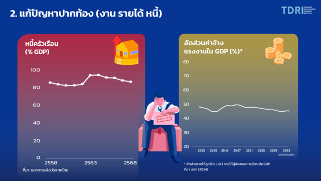 ดร.สมเกียรติระบุว่า ต้นตอสำคัญของปัญหาหนี้ครัวเรือนคือรายได้ที่เติบโตช้า ซึ่งสัมพันธ์กับการขยายตัวทางเศรษฐกิจที่อ่อนแรง และคุณภาพค่าจ้างแรงงานที่ไม่ดี โดยเห็นได้ชัดว่าสัดส่วนค่าจ้างแรงงานต่อ GDP ของไทยลดลงต่อเนื่อง ถือเป็นสัญญาณน่ากังวล ประเทศไทยจึงจำเป็นต้องเร่งสร้าง “งานที่ดี” หมายถึงงานที่มีรายได้เหมาะสม มีความมั่นคงในระดับหนึ่ง ซึ่งจะเกิดขึ้นได้ก็ต่อเมื่อมีการปฏิรูปกระบวนการอนุญาตและอนุมัติให้ทำธุรกิจ การพัฒนาทักษะแรงงาน และการแก้ปัญหาหนี้อย่างตรงจุด ไม่ใช่การยกหนี้แบบเหมาเข่ง แต่ต้องแก้ที่พฤติกรรมการใช้เงินของประชาชนควบคู่กันไป