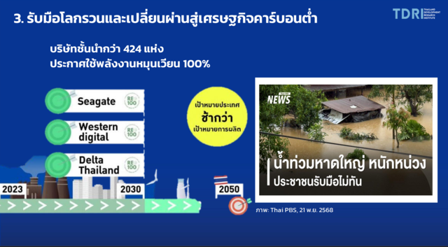ดร.สมเกียรติ กล่าวว่า การรับมือกับโลกร้อนและโลกรวนเป็นโจทย์สำคัญลำดับที่สามของรัฐบาลใหม่ โดยมีความท้าทายหลักสองด้าน ด้านแรกคือการลดการปล่อยก๊าซเรือนกระจก ซึ่งแม้รัฐบาลไทยจะประกาศเร่งเป้าหมายความเป็นกลางทางคาร์บอนจากปี 2065 มาเป็นปี 2050 แล้ว แต่ยังถือว่าช้ากว่าเป้าหมายของภาคเอกชนจำนวนมาก โดยเฉพาะบริษัทข้ามชาติในอุตสาหกรรมอิเล็กทรอนิกส์และอุตสาหกรรมเทคโนโลยี ที่ตั้งเป้าใช้พลังงานหมุนเวียน 100% เพื่อมุ่งสู่ Net Zero ขององค์กร และแนวโน้มของบริษัทลักษณะนี้จะเพิ่มขึ้นอย่างต่อเนื่อง หากไทยไม่ปรับตัวให้ทัน ก็เสี่ยงเสียโอกาสการลงทุน