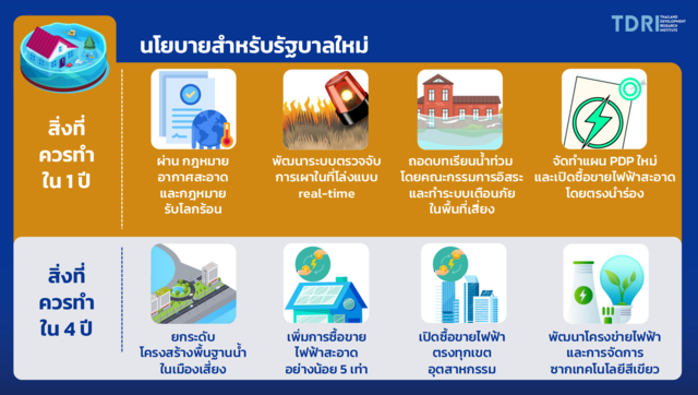 อีกด้านหนึ่งคือความจริงที่ว่า อุณหภูมิโลกจะยังคงเพิ่มสูงขึ้น และการจำกัดการเพิ่มขึ้นไม่ให้เกิน 1.5 องศาเซลเซียสจากยุคก่อนอุตสาหกรรมแทบเป็นไปไม่ได้แล้ว สิ่งที่ไทยต้องเผชิญคือภัยธรรมชาติที่เกิดบ่อยและรุนแรงขึ้น เช่น เหตุการณ์น้ำท่วมภาคใต้ในช่วงที่ผ่านมา ดร.สมเกียรติระบุว่า ภายในหนึ่งปีแรก รัฐบาลใหม่ควรเร่งผลักดันกฎหมายอากาศสะอาด ซึ่งค้างอยู่ในรัฐสภา แม้จะได้รับการสนับสนุนจากประชาชนอย่างกว้างขวางและผ่านการพิจารณามาอย่างยาวนาน แต่ต้องสะดุดลงจากการยุบสภา พร้อมกันนั้นควรเดินหน้ากฎหมายว่าด้วยการเปลี่ยนแปลงสภาพภูมิอากาศที่ผ่านการยกร่างและรับฟังความคิดเห็นแล้ว เพื่อให้รัฐมีเครื่องมือรับมือปัญหาโลกร้อน โลกรวน และปัญหา PM2.5 อย่างเป็นระบบ