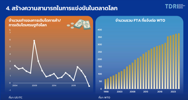 ดร.สมเกียรติ กล่าวว่า ประเด็นที่สี่ซึ่งรัฐบาลใหม่ต้องเร่งขับเคลื่อนคือการสร้างความสามารถในการแข่งขันของไทยในตลาดโลก ท่ามกลางบริบทการค้าโลกที่เปลี่ยนไปอย่างรวดเร็ว โดยเฉพาะการใช้มาตรการกีดกันทางการค้าของสหรัฐอเมริกา ขณะเดียวกัน สินค้าจากจีนก็หลั่งไหลเข้ามาในตลาดไทยอย่างต่อเนื่อง ภาพรวมดังกล่าวทำให้การค้าโลกเติบโตช้ากว่าการเติบโตของเศรษฐกิจโลกอย่างมีนัยสำคัญ