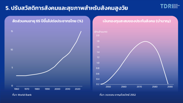 ดร.สมเกียรติ กล่าวว่าประเด็นที่ห้าซึ่งรัฐบาลใหม่หลีกเลี่ยงไม่ได้ คือการปรับระบบสวัสดิการสังคมและสุขภาพให้สอดรับกับสังคมสูงวัย ทั้งด้านการรักษาพยาบาลและระบบบำนาญ โดยชี้ว่าไทยมีสัดส่วนประชากรอายุ 65 ปีขึ้นไปเกือบ 15% ของประชากรทั้งหมด และก้าวเข้าสู่สังคมสูงวัยอย่างสมบูรณ์แล้ว ความเปลี่ยนแปลงนี้ทำให้รัฐต้องยอมรับ “ความจริงใหม่” และเตรียมระบบรองรับอย่างเป็นระบบ
