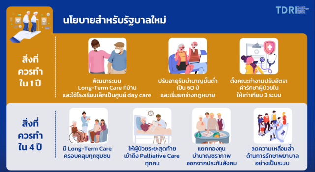 ดร.สมเกียรติระบุว่า สิ่งที่ต้องเร่งเตรียมคือระบบดูแลระยะยาว (Long-term Care) สำหรับผู้สูงอายุ และระบบการดูแลแบบประคับประคอง (Palliative Care) สำหรับผู้ป่วยระยะสุดท้าย หากรัฐไม่ลงทุนและจัดการให้ดี จะนำไปสู่ภาระค่าใช้จ่ายด้านการรักษาพยาบาลจำนวนมาก เพิ่มภาระต่อฐานะการคลัง และยังสร้างต้นทุนแฝงต่อครอบครัว เพราะลูกหลานต้องเสียเวลาออกจากงานมาดูแลผู้สูงอายุ ขณะเดียวกัน การพัฒนาระบบดูแลเหล่านี้ยังสามารถสร้างงานใหม่ โดยเฉพาะอาชีพผู้ดูแลหรือ caregivers ได้ในระยะยาว