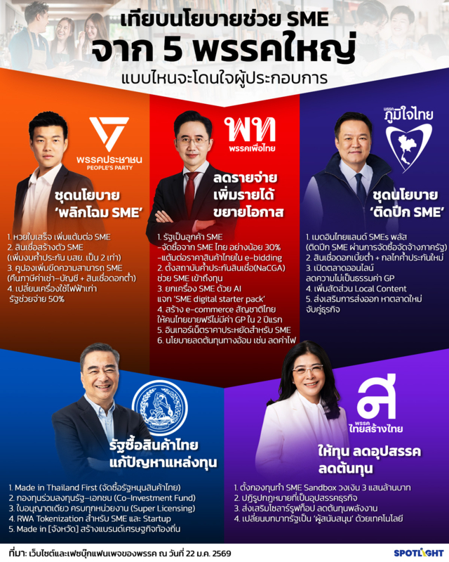 ในห้วงเวลานับถอยหลังสู่การเลือกตั้งที่กำลังจะเกิดขึ้นในอีกไม่กี่วันนี้ SPOTLIGHT ชวนมาดูกันว่า พรรคการเมืองดัง 5 พรรคได้เสนอนโยบายช่วยผู้ประกอบการ SME อย่างไรบ้าง