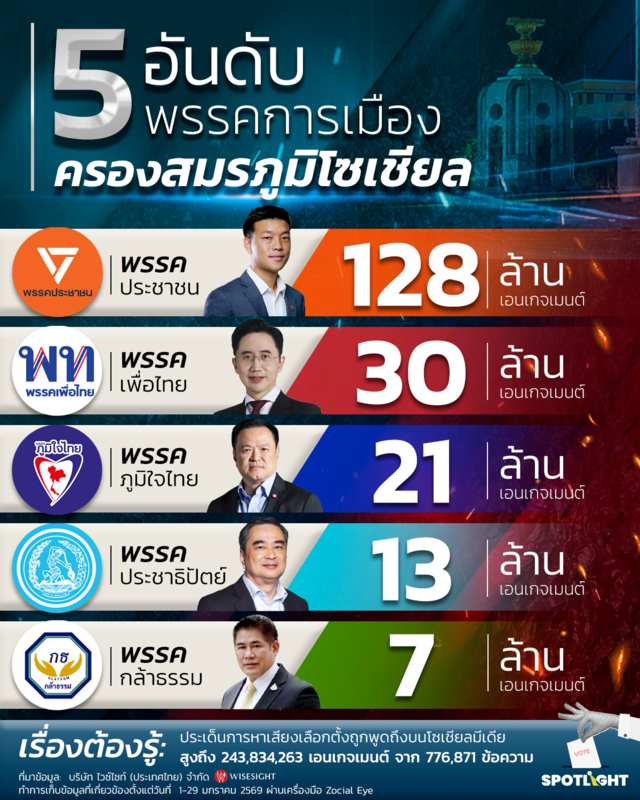 ข้อมูลจาก บริษัท ไวซ์ไซท์ (ประเทศไทย) จำกัด ที่เก็บข้อมูลระหว่างวันที่ 1–29 มกราคม 2569 ผ่านเครื่องมือ Zocial Eye พบว่า การพูดถึงประเด็นการหาเสียงเลือกตั้งบนโซเชียลมีเดียพุ่งสูงถึง 243,834,263 เอนเกจเมนต์ จาก 776,871 ข้อความตอกย้ำชัดว่า คนไทยใช้โซเชียลจำนวนมาก และโลกออนไลน์คือหัวใจสำคัญของการหาเสียงยุคนี้อย่างหลีกเลี่ยงไม่ได้
