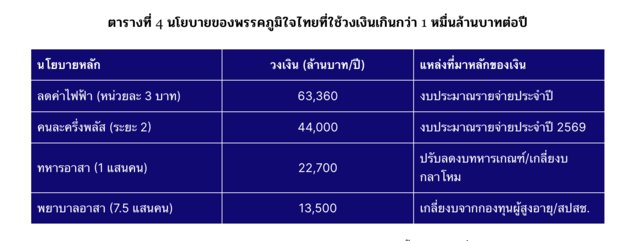 2. นโยบาย “ค่าไฟฟ้าหน่วยละ 3 บาท” (สำหรับ 300 ยูนิตแรก) ซึ่งพรรคภูมิใจไทยประมาณการว่าจะใช้เงิน 6.3 หมื่นล้านบาท น่าจะต่ำเกินไป เพราะตั้งอยู่บนฐานราคาค่าไฟฟ้าเฉลี่ยที่ผู้บริโภคจ่ายที่ 4.20 บาทต่อหน่วย อย่างไรก็ตาม เมื่อประเมินเทียบกับต้นทุนที่แท้จริงของระบบที่ 4.58 บาทต่อหน่วย (แบ่งเป็นค่าไฟฟ้าฐานประมาณ 3.78 บาท และค่า Ft ที่ควรเรียกเก็บจริงประมาณ 79.75 สตางค์) ภาระทางการคลังที่เกิดขึ้นจริงจะสูงขึ้นเป็น 7.5 หมื่นล้านบาทต่อปี