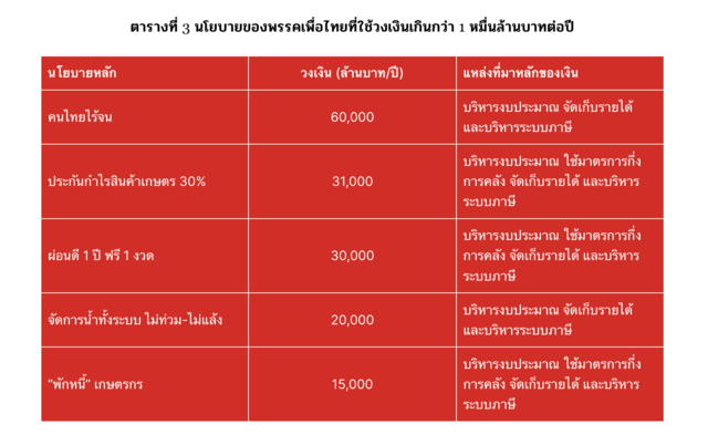 TDRI ระบุว่า พรรคเพื่อไทยแจ้งว่าจะใช้งบประมาณ 2.4 แสนล้านบาทต่อปี โดยมี 5 นโยบายที่มีวงเงินเกินกว่า 1 หมื่นล้านบาท นอกจากนโยบาย “คนไทยไร้จน” ที่ใช้วงเงินมากที่สุดแล้ว พรรคเพื่อไทยยังมีนโยบายจัดการหนี้สินของคนกลุ่มต่าง ๆ เช่น นโยบาย “พักหนี้เกษตรกร” (1.5 หมื่นล้านบาท) นโยบาย “ล้างหนี้นอกระบบ” (6 พันล้านบาท) นโยบาย “ล้างหนี้วัยเกษียณ” (4 พันล้านบาท) และนโยบาย “ผ่อนดี 1 ปี ฟรี 1 งวด” (3 หมื่นล้านบาท) นอกจากนี้พรรคเพื่อไทยยังมีนโยบายด้านการเกษตรอีกหลายนโยบาย เช่น นโยบาย “ประกันกำไรสินค้าเกษตร 30%”