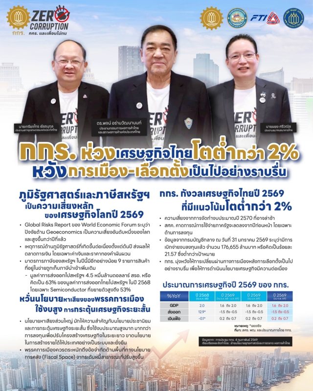 กกร. แสดงความกังวลต่อแนวโน้มเศรษฐกิจไทยในปี 2569 ซึ่งมีความเสี่ยงขยายตัวต่ำกว่าระดับร้อยละ 2 ท่ามกลางแรงกดดันจากปัจจัยทั้งภายในและภายนอกประเทศ โดยเฉพาะความไม่แน่นอนด้านนโยบายและจังหวะการขับเคลื่อนเศรษฐกิจของภาครัฐ อีกทั้งยังมีความเสี่ยงเพิ่มเติมจากกระบวนการจัดทำงบประมาณรายจ่ายประจำปีงบประมาณ 2570 ที่อาจเผชิญความล่าช้า ซึ่งอาจส่งผลกระทบต่อความต่อเนื่องของการลงทุนและการกระตุ้นเศรษฐกิจในระยะถัดไป