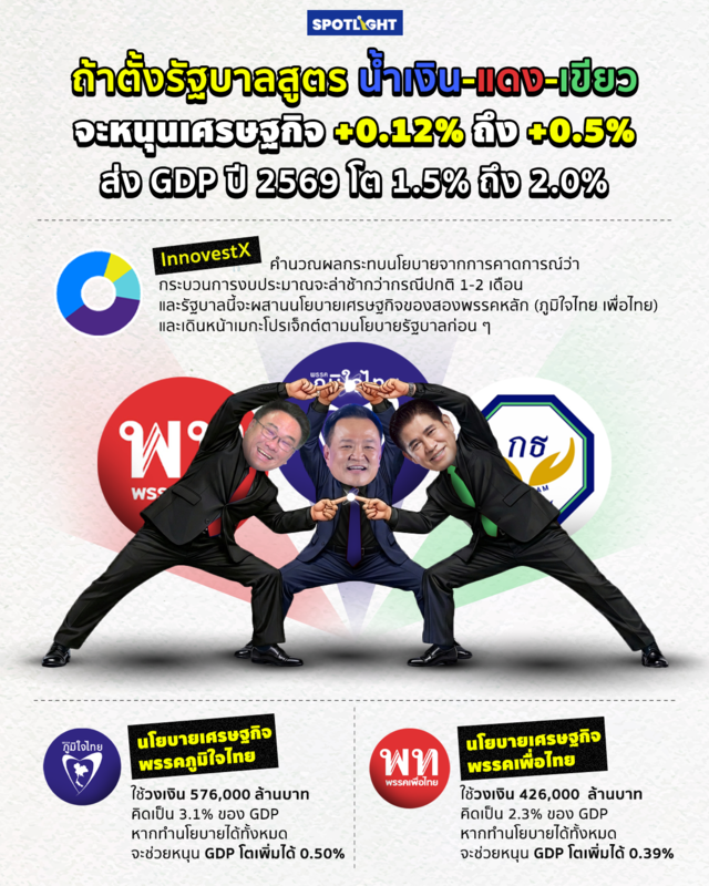 InnovestX ประเมินว่า หากพรรคภูมิใจไทยและพรรคเพื่อไทยร่วมกันจัดตั้งรัฐบาล นโยบายเศรษฐกิจของทั้งสองพรรคอาจส่งผลบวก (มี upside) ต่อ GDP อย่างน้อย +0.12% ถึง 0.5% ซึ่งจะส่งผลให้ GDP ปี 2569 อาจโต 1.5% ถึง 2.0% (เบื้องต้นมองว่ามี upside ประมาณ +0.3% หรือโต 1.7%) ขึ้นอยู่กับลักษณะและขนาดของโครงการ รวมถึงความเร็วในการดำเนินการ