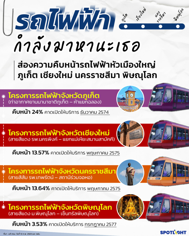 SPOTLIGHT ชวนส่องความคืบหน้าและดูรายละเอียดของโครงการรถไฟฟ้าหัวเมืองใหญ่เหล่านี้ว่ามีโครงการมีรายละเอียดอย่างไร คืบหน้าไปถึงไหนแล้ว คาดการณ์ว่าจะได้ใช้งานกันในปีไหน โดยใช้ข้อมูลความคืบหน้าจากที่ รฟม.รายงานต่อคณะรัฐมนตรี และข้อมูลรายละเอียดโครงการจากเว็บไซต์ รฟม. (mrta.co.th) สืบค้นวันที่ 12 กุมภาพันธ์ 2569