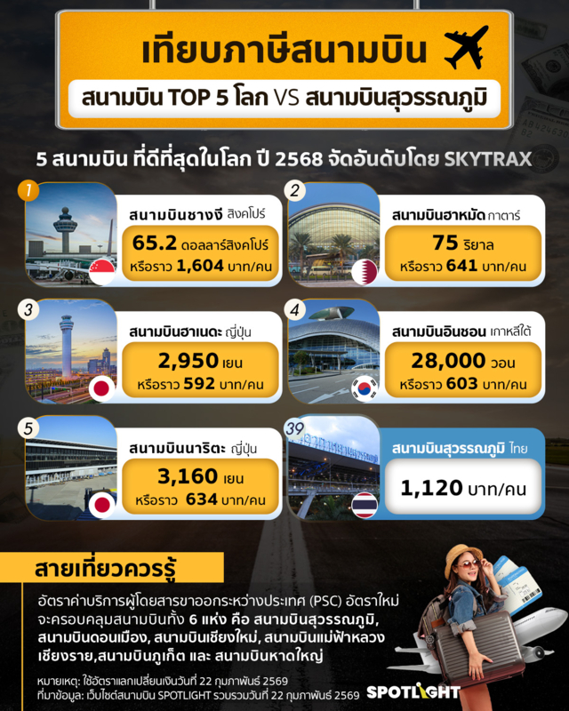 ตัวเลขดังกล่าวสะท้อนว่า ไทยกำลังจะเก็บ PSC สูงกว่าสนามบินถึง 5 แห่งใน Top 6 ของโลก คำถามจึงอยู่ที่ว่า เมื่อผู้โดยสารต้องจ่ายในระดับใกล้เคียง “สนามบินโลก” แล้ว คุณภาพบริการและประสบการณ์ที่ได้รับจะอยู่ในระดับใด