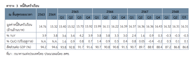 ข้อมูลจาก สำนักงานสภาพัฒนาการเศรษฐกิจและสังคมแห่งชาติ (สภาพัฒน์) ระบุว่า ในไตรมาสสาม ปี 2568 หนี้ครัวเรือนมีมูลค่ารวม 16.31 ล้านล้านบาท ลดลงเล็กน้อยร้อยละ 0.29 เมื่อเทียบกับช่วงเดียวกันของปีก่อนหน้า การปรับลดดังกล่าวสะท้อนความระมัดระวังของสถาบันการเงินในการปล่อยสินเชื่อใหม่ ท่ามกลางสัญญาณชัดเจนว่าความสามารถในการชำระหนี้ของครัวเรือนไทยกำลังถดถอยลง แม้หนี้รวมจะลดลง แต่สัดส่วนหนี้ครัวเรือนต่อ GDP ยังคงทรงตัวอยู่ที่ร้อยละ 86.8 ต่อเนื่องจากไตรมาสก่อนหน้า สะท้อนว่าภาระหนี้ยังอยู่ในระดับสูงเมื่อเทียบกับขนาดเศรษฐกิจ