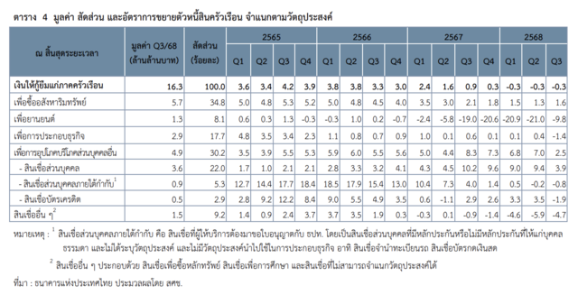 ในทางตรงกันข้าม สินเชื่อเพื่อซื้ออสังหาริมทรัพย์กลับขยายตัวเร่งขึ้นจากร้อยละ 1.3 ในไตรมาสก่อนหน้าเป็นร้อยละ 1.6 โดยได้รับแรงสนับสนุนจากมาตรการกระตุ้นภาคอสังหาริมทรัพย์ ทั้งการผ่อนคลายเกณฑ์การกำกับดูแลสินเชื่อต่อมูลค่าหลักประกัน (LTV) เป็นการชั่วคราว การต่ออายุมาตรการลดค่าธรรมเนียมการโอนและจดจำนอง รวมถึงแนวโน้มอัตราดอกเบี้ยที่เริ่มปรับลดลง