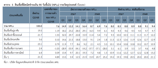 แม้ยอดหนี้รวมจะลดลง แต่คุณภาพหนี้ครัวเรือนกลับส่งสัญญาณน่ากังวล ข้อมูลจากบริษัท ข้อมูลเครดิตแห่งชาติ จำกัด ระบุว่า ในไตรมาสสาม ปี 2568 หนี้ครัวเรือนที่ค้างชำระเกิน 90 วันขึ้นไป หรือ NPLs มีมูลค่า 1.3 ล้านล้านบาท เพิ่มขึ้นร้อยละ 7.6 จากช่วงเดียวกันของปีก่อน คิดเป็นสัดส่วนร้อยละ 9.4 ของสินเชื่อรวม และเพิ่มขึ้นต่อเนื่องจากไตรมาสหนึ่งและไตรมาสสองของปีเดียวกัน