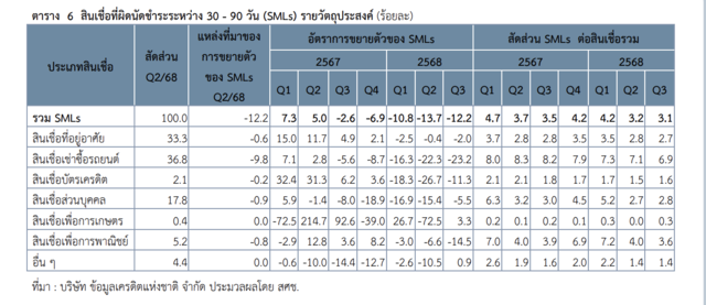 การเพิ่มขึ้นของ NPLs พบในทุกประเภทสินเชื่อ สะท้อนว่าปัญหาคุณภาพหนี้ไม่ได้จำกัดอยู่ในภาคส่วนใดภาคส่วนหนึ่ง ขณะเดียวกัน หากพิจารณาหนี้ที่ค้างชำระระยะสั้น 1-3 เดือน หรือ SMLs พบว่าสัดส่วนต่อสินเชื่อรวมปรับลดลงเหลือร้อยละ 3.1 จากร้อยละ 3.2 ในไตรมาสก่อน และลดลงเกือบทุกประเภทสินเชื่อ ยกเว้นสินเชื่อเพื่อการเกษตร