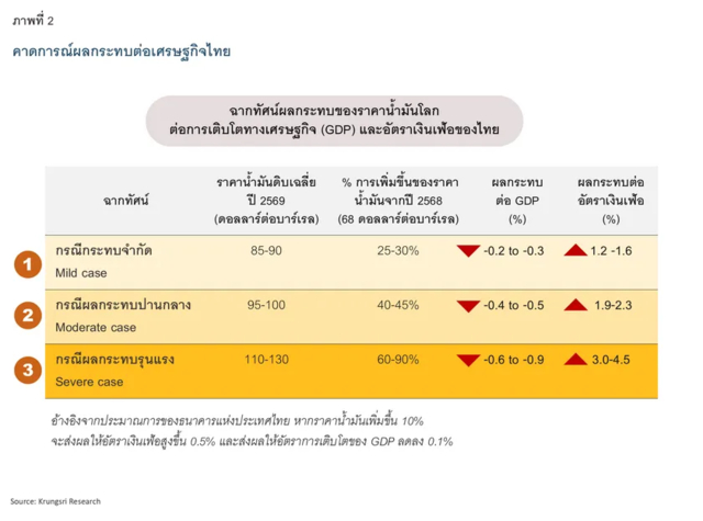 ศูนย์วิจัยกรุงศรี ธนาคารกรุงศรีอยุธยา จำกัด (มหาชน) มองว่า สำหรับประเทศไทยซึ่งเป็นผู้นำเข้าน้ำมันสุทธิ ผลกระทบจากราคาพลังงานที่เพิ่มขึ้นมีแนวโน้มส่งผ่านสู่ต้นทุนการผลิต ค่าขนส่ง และค่าครองชีพภายในประเทศ โดยหากราคาน้ำมันโลกเฉลี่ยทั้งปีปรับขึ้นสู่ระดับ 110-130 ดอลลาร์ต่อบาร์เรล เงินเฟ้อไทยอาจเร่งตัวขึ้นสู่ระดับ 3-4.5% ขณะที่อัตราการเติบโตทางเศรษฐกิจอาจลดลงจากกรณีฐานประมาณ 0.6-0.9% พร้อมเพิ่มแรงกดดันต่อหลายอุตสาหกรรมที่พึ่งพาพลังงานและการนำเข้าวัตถุดิบจากต่างประเทศ