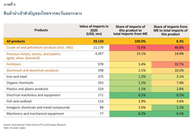 ในปี 2568 มูลค่าการนำเข้าของไทยจากตะวันออกกลางอยู่ที่ 29,150 ล้านดอลลาร์สหรัฐ คิดเป็น 8.3% ของการนำเข้าทั้งหมดของไทย โดยนอกจากการนำเข้าพลังงานแล้ว ไทยยังนำเข้าปัจจัยการผลิตอื่นๆ ที่สำคัญ เช่น ผลิตภัณฑ์ปิโตรเลียม ปุ๋ย อะลูมิเนียม เหล็ก เคมีภัณฑ์ เม็ดพลาสติกและผลิตภัณฑ์พลาสติก จากภูมิภาคนี้ในสัดส่วนที่สูง ซึ่งอาจกระทบอุตสาหกรรมปลายน้ำ โดยแหล่งนำเข้าหลักคือสหรัฐอาหรับเอมิเรตส์ (UAE) ซาอุดีอาระเบีย และกาตาร์ ขณะที่การนำเข้าจากอิสราเอลและอิหร่านมีสัดส่วนเพียงเล็กน้อย