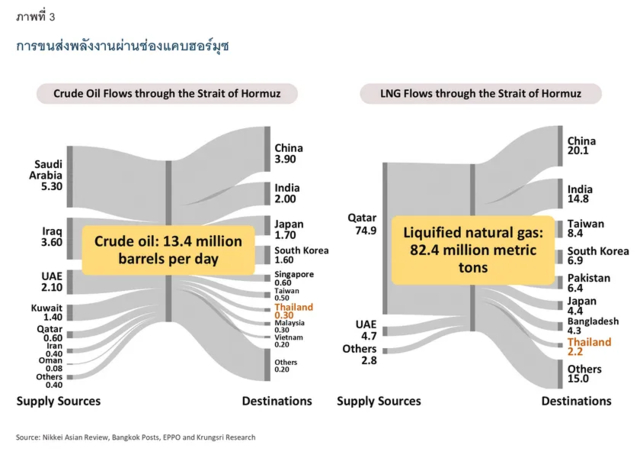 สำหรับประเทศไทย ผลกระทบจะขึ้นอยู่กับระดับความรุนแรงและระยะเวลาของความขัดแย้งในตะวันออกกลาง โดยช่องทางหลักมาจากต้นทุนพลังงาน ต้นทุนสินค้าและค่าขนส่งที่สูงขึ้น ซึ่งสร้างแรงกดดันต่อเงินเฟ้อและอาจทำให้อัตราการเติบโตทางเศรษฐกิจลดลงจากกรณีฐานประมาณ -0.2 ถึง -0.9%